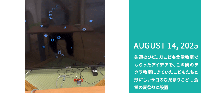 先週のひだまりこども食堂教室でもらったアイデアを、この間のラクラ教室にきていたこどもたちと形にし、今日のひだまりこども食堂の夏祭りに設置