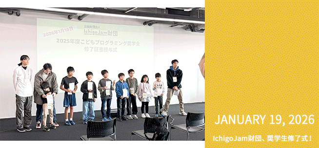 公益財団法人IchigoJam財団第一期修了証授与式、ライブコーディング「メガネジャンプ」 on PixelJam
