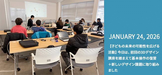 【子どもの未来の可能性を広げる活動】今日は、前回の3Dデザイン講座を踏まえて基本操作の復習+新しいデザイン課題に取り組みました