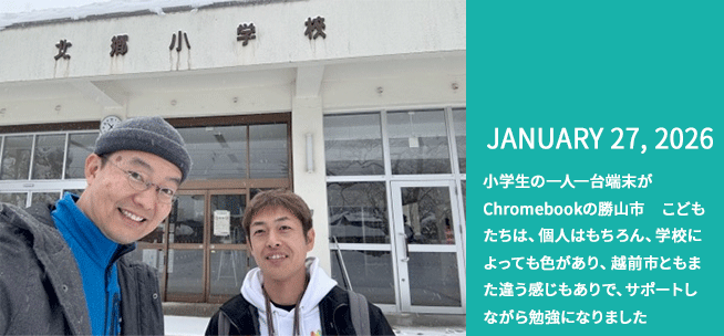 小学生の一人一台端末がChromebookの勝山市 こどもたちは、個人はもちろん、学校によっても色があり、越前市ともまた違う感じもありで、サポートしながら勉強になりました