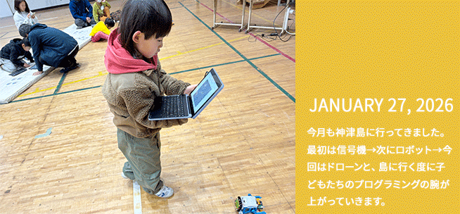 今月も神津島に行ってきました。最初は信号機→次にロボット→今回はドローンと、島に行く度に子どもたちのプログラミングの腕が上がっていきます。