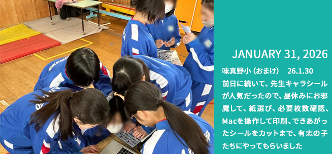 味真野小(おまけ) 26.1.30 前日に続いて、先生キャラシールが人気だったので、昼休みにお邪魔して、紙選び、必要枚数確認、Macを操作して印刷、できあがったシールをカットまで、有志の子たちにやってもらいました