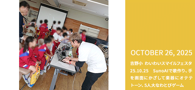 吉野小 わいわいスマイルフェスタ 25.10.25 SunoAIで歌作り、手を画面にかざして楽器にオテテトーン、5人大なわとびゲーム