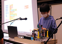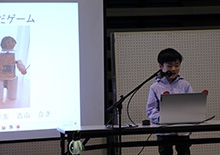 展示会場が賑わう中、11時からは作品プレゼンがスタート。こども達がスクリーンの前に立ち、作品の見どころや工夫したポイント、制作に込めた想いを発表しました。限られた時間の中で自分の作品を伝える姿からは、それぞれの作品への自信と誇りが感じられ、来場者も真剣に聞き入っていました。